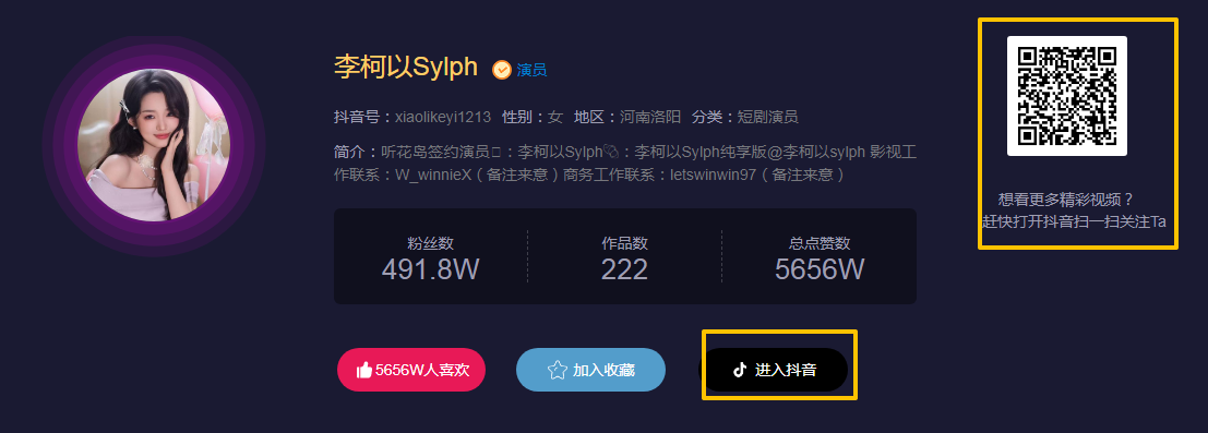 2.接着可以点击页面内的“进入抖音”按钮直接进入抖音页面查看账号内容,或者用手机扫一扫(微信或者抖音扫一扫都可以)查看内容,如下图: